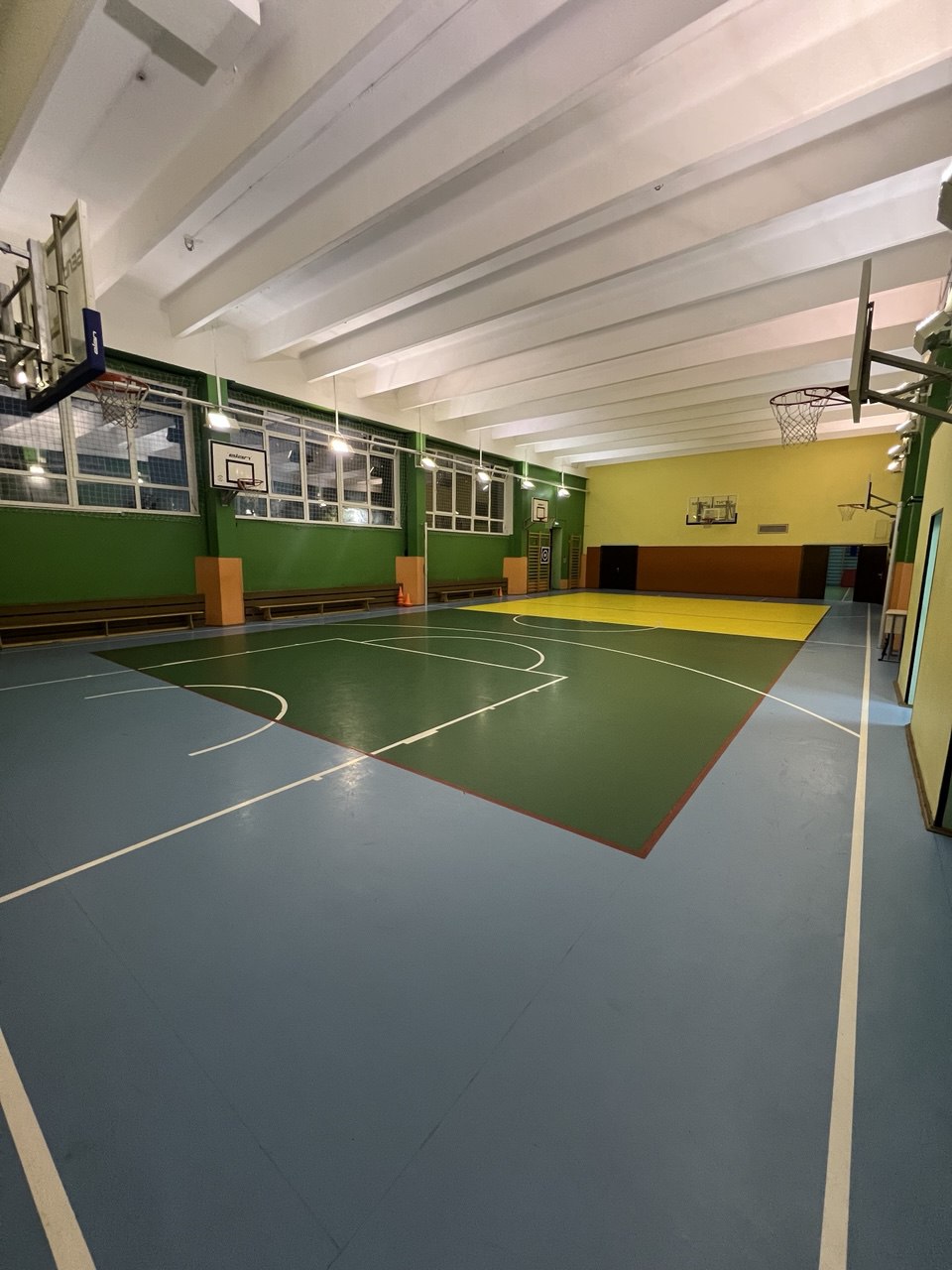 Тренировки проходят в школьном зале, зал хорошо оборудован.